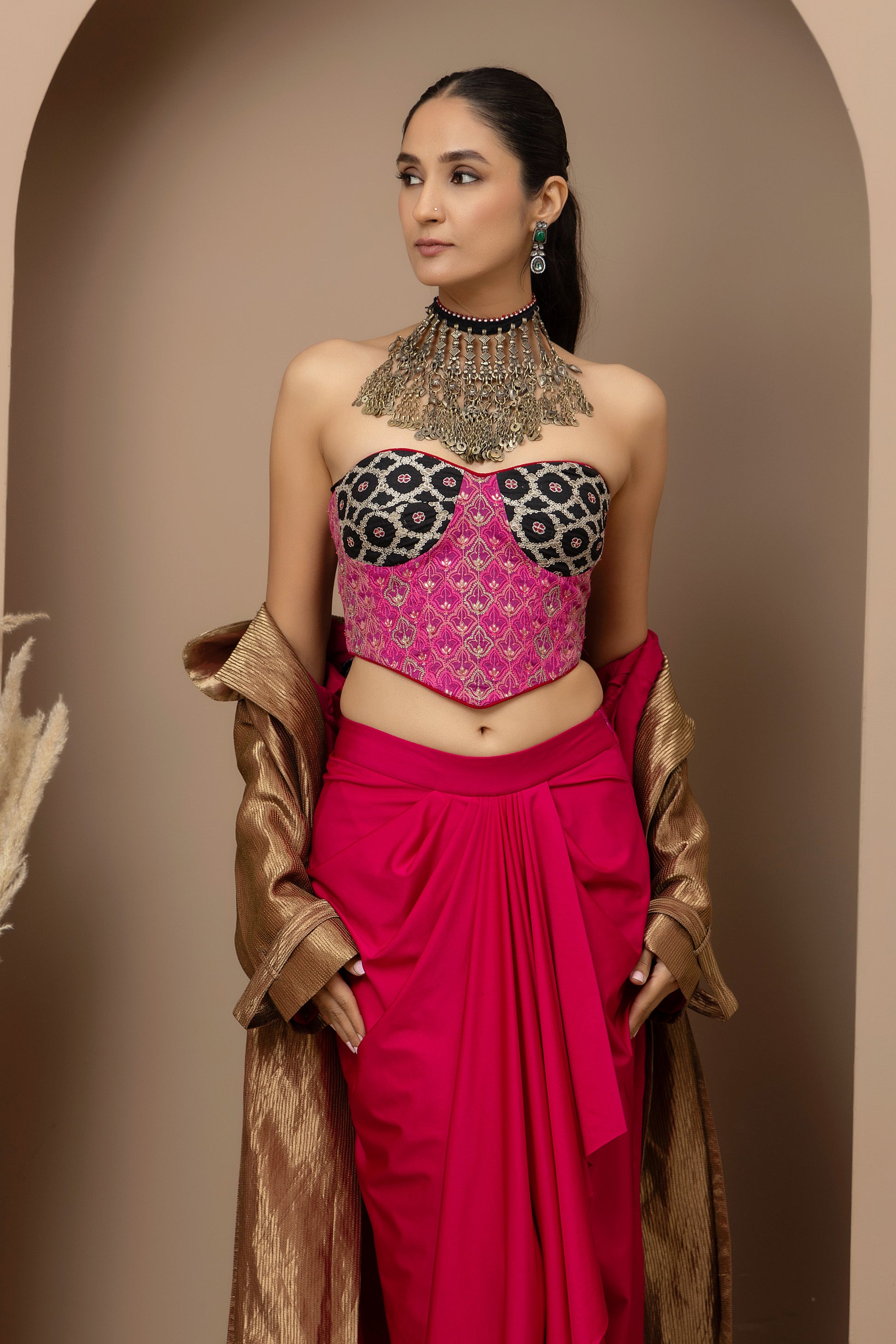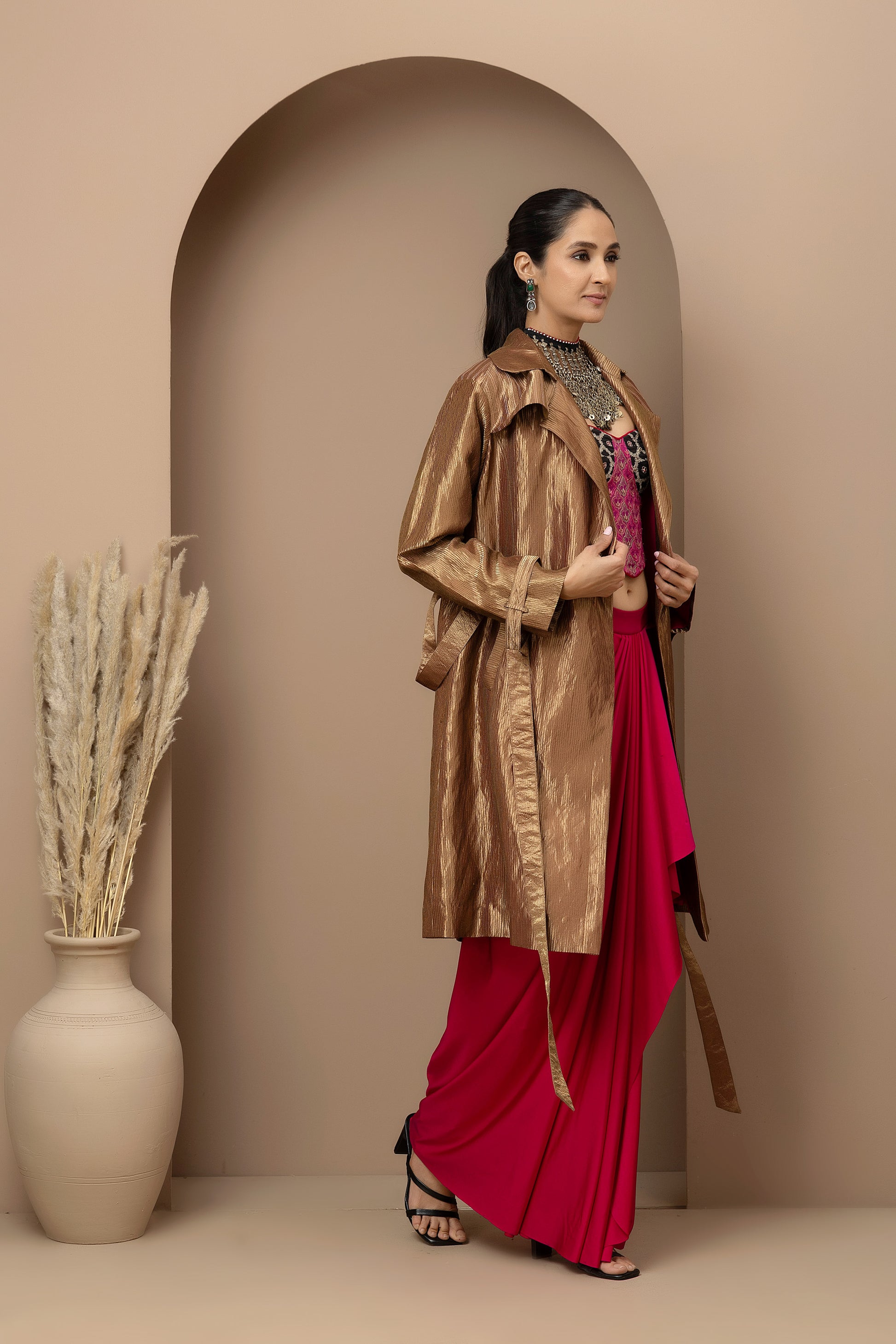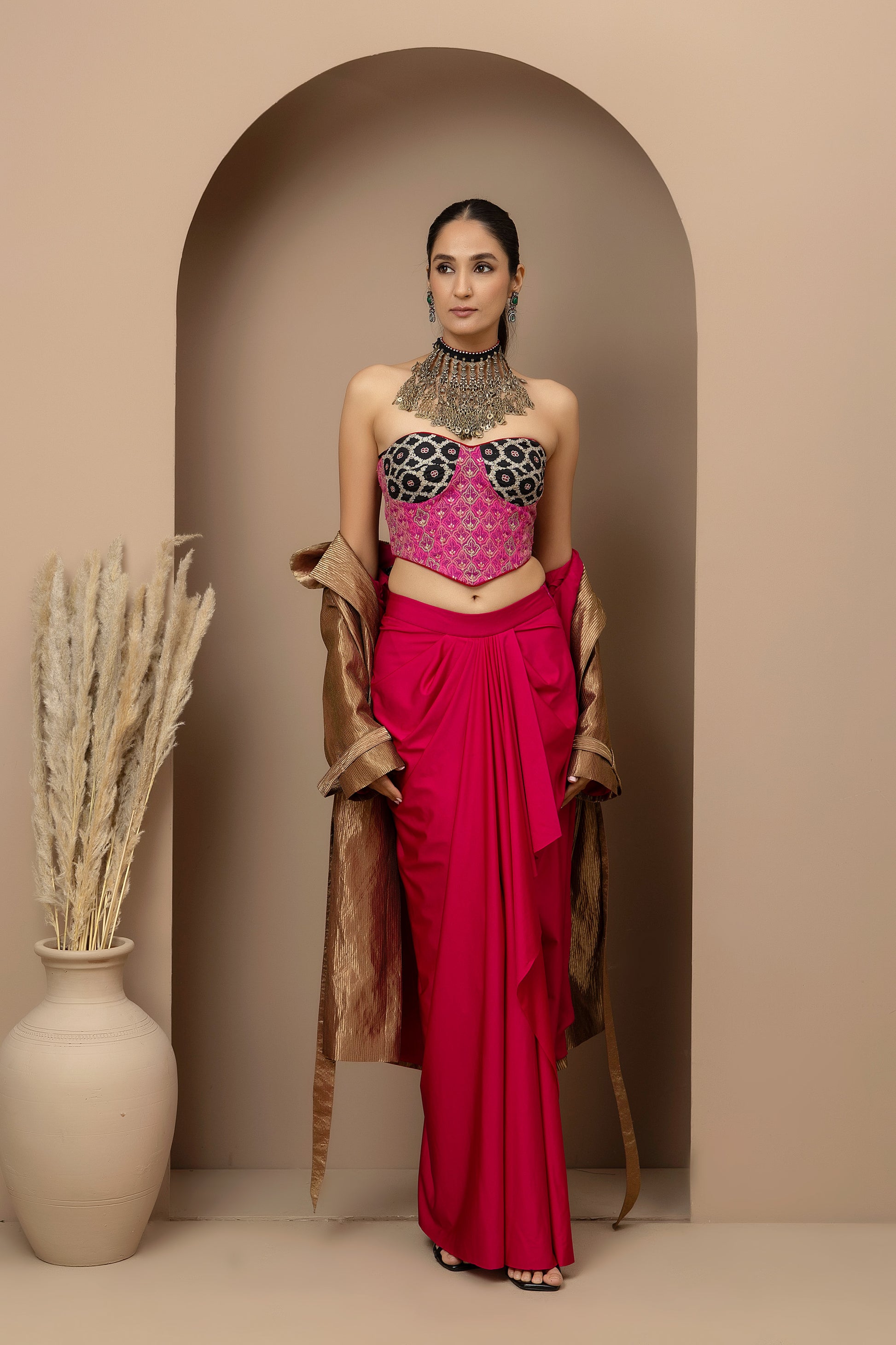 MMD/GUL/112 Aari embroidered corset blouse with lycra-stitched dhoti pants, complemented by a gold tissue jacket for a refined contemporary look.