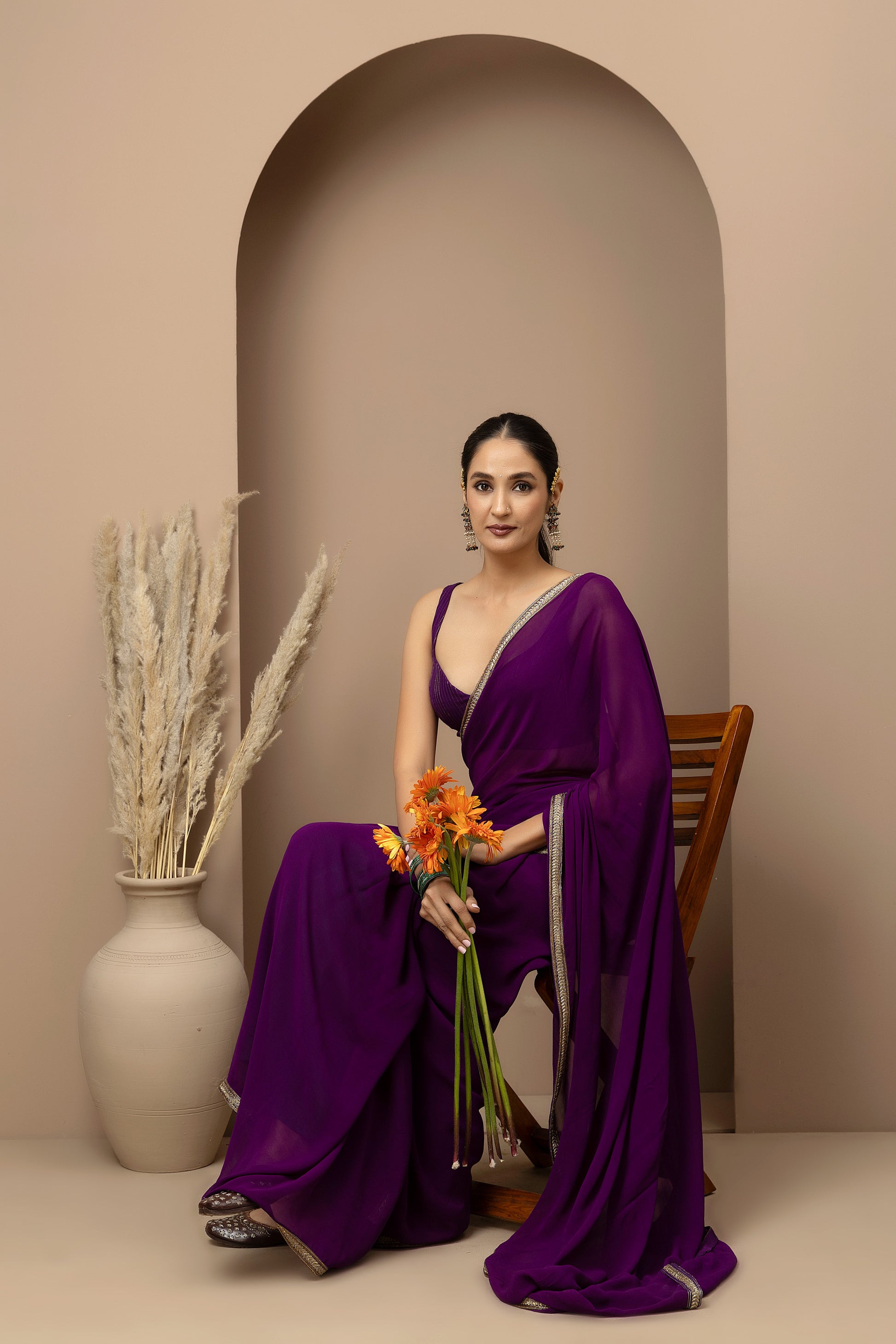MMD/GUL/117 A soft georgette saree with a handcrafted border, paired with a tailored blouse for refined contemporary elegance.